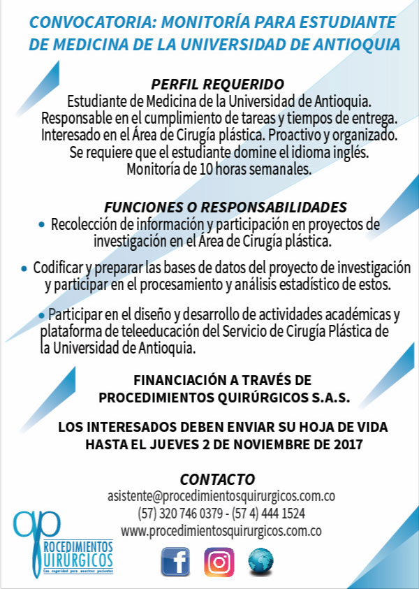 ¡¡CONVOCATORIA ABIERTA!!En Procedimientos Quirúrgicos estamos buscando un estudiante de la Facultad de Medicina – Universidad de Antioquia que esté interesado en postularse para ser monitor en el Área de Cirugía …