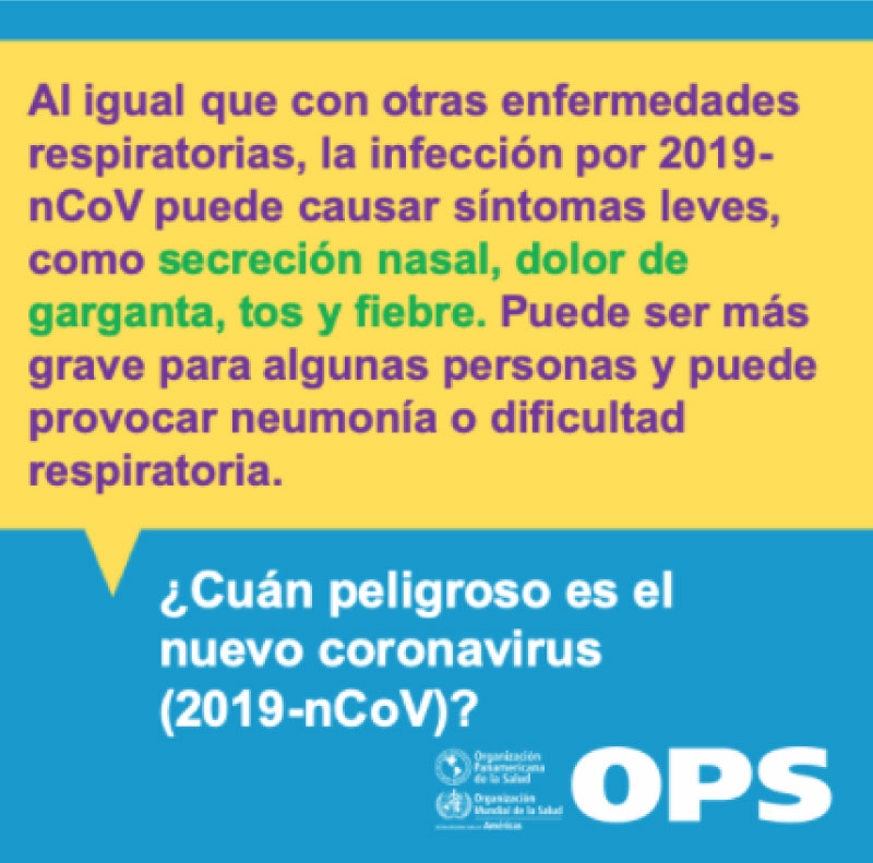 Al igual que con otras enfermedades respiratorias, la infección por Covid 2019 puede causar síntomas leves, como secreción nasal, dolor de garganta, tos y fiebre. Puede ser más grave para algunas personas y puede provocar neumonía y dificultad respiratoria.