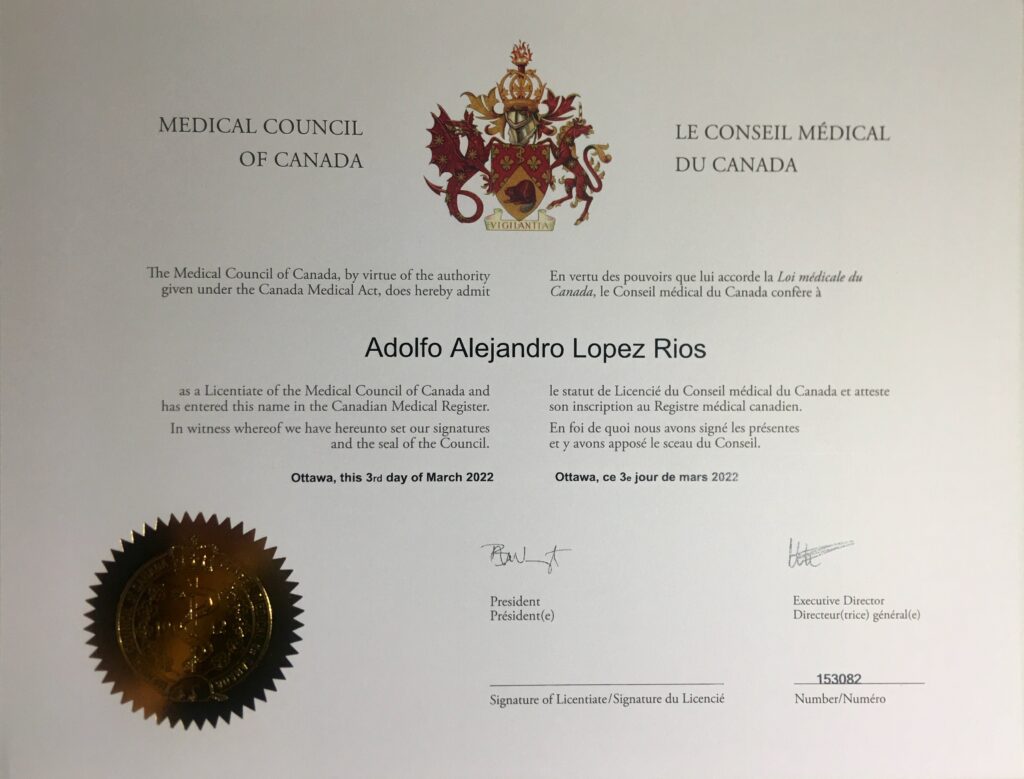Dr. Adolfo Alejandro López Rios Dr. Adolfo Alejandro Lopez Rios Resumen profesional Empleo actual Empleos previos Educación Empleos académicos Visitas clínicas o pasantías Premios académicos Experiencia médica Experiencia investigativa Afiliaciones académicas Cursos y reuniones académicas Voluntariados Licencias – Exámenes médicos y de Inglés LICENSES Medical License to practice Medicine, Republic of Colombia, License Number 5-0064-2002. MEDICAL COUNCIL OF CANADA EXAMINATIONS Medical Council of Canada Evaluating Examination MCCEE Final Standing: Pass.Medical Council of Canada Qualifying Examination Part 1 MCCQE1 Final Standing: Pass.National Assessment Collaboration Examination NAC OSCE Final result: Pass. Back
